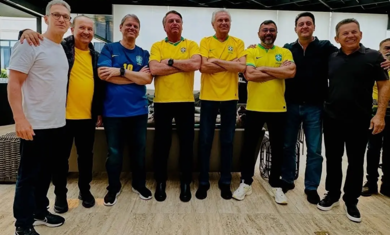 Governadores de direita com o ex-presidente: Romeu Zema, Jorginho Mello, Tarcísio de Freitas, Jair Bolsonaro, Ronaldo Caiado, Wilson Lima, Ratinho Junior e Mauro Mendes. Foto: reprodução