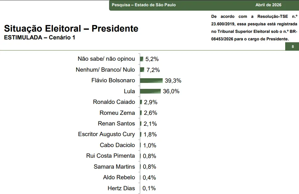 Os votos em branco, nulo ou nenhum candidato somam 7,2%, e outros 5,2% dos entrevistados disseram não saber ou preferiram não opinar. O quadro reforça que, embora Flávio lidere, ainda existe espaço para movimentação na corrida em São Paulo, principalmente porque Lula conseguiu encurtar a distância em relação ao adversário e aparece competitivo no estado.