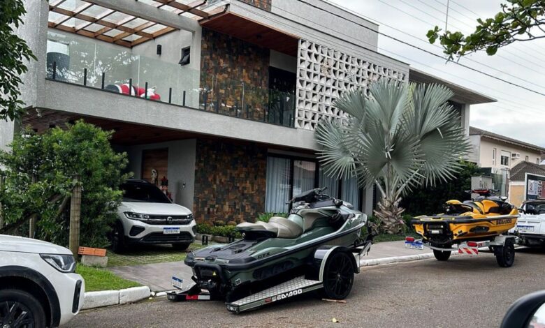 No local, a PF apreendeu três motocicletas avaliadas entre R$ 80 mil e R$ 200 mil, além de dois jetskis, um veículo utilitário esportivo (SUV), joias e documentos.